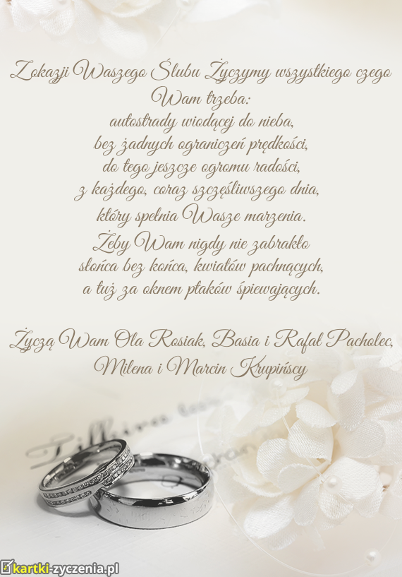 Szczęśliwa Młoda Paro! Życzymy Wam w uroczystym dniu ślubu miłości gorącej jak słońce, szlachetnej jak złoto, czystej jak łza, słodkiej jak miód oraz spełnienia wszystkich marzeń i planów, które spełnią wasze marzenia