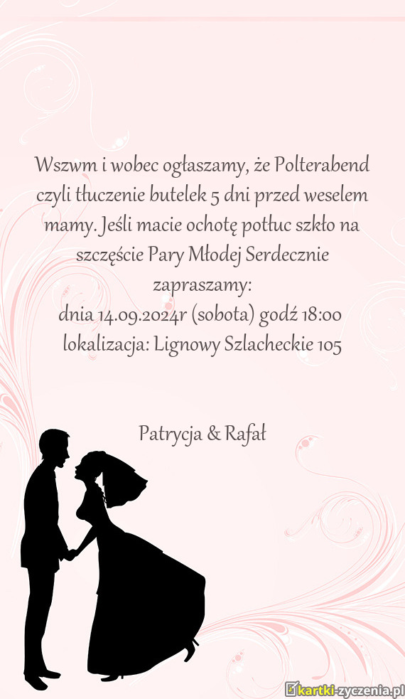 Wszem i wobec ogłaszamy, że Polterabend czyli tłuczenie butelek 5 dni przed weselem mamy. Jeśli - Gotowa kartka na ślub